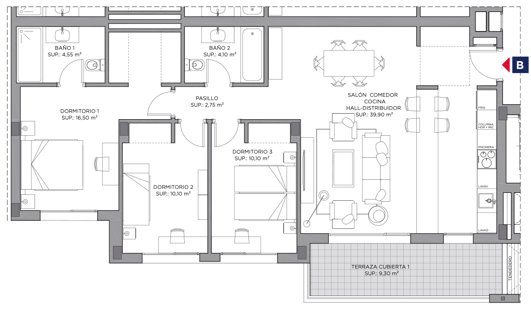 • Hall-Salón-Comedor-Cocina: 39,90 m²